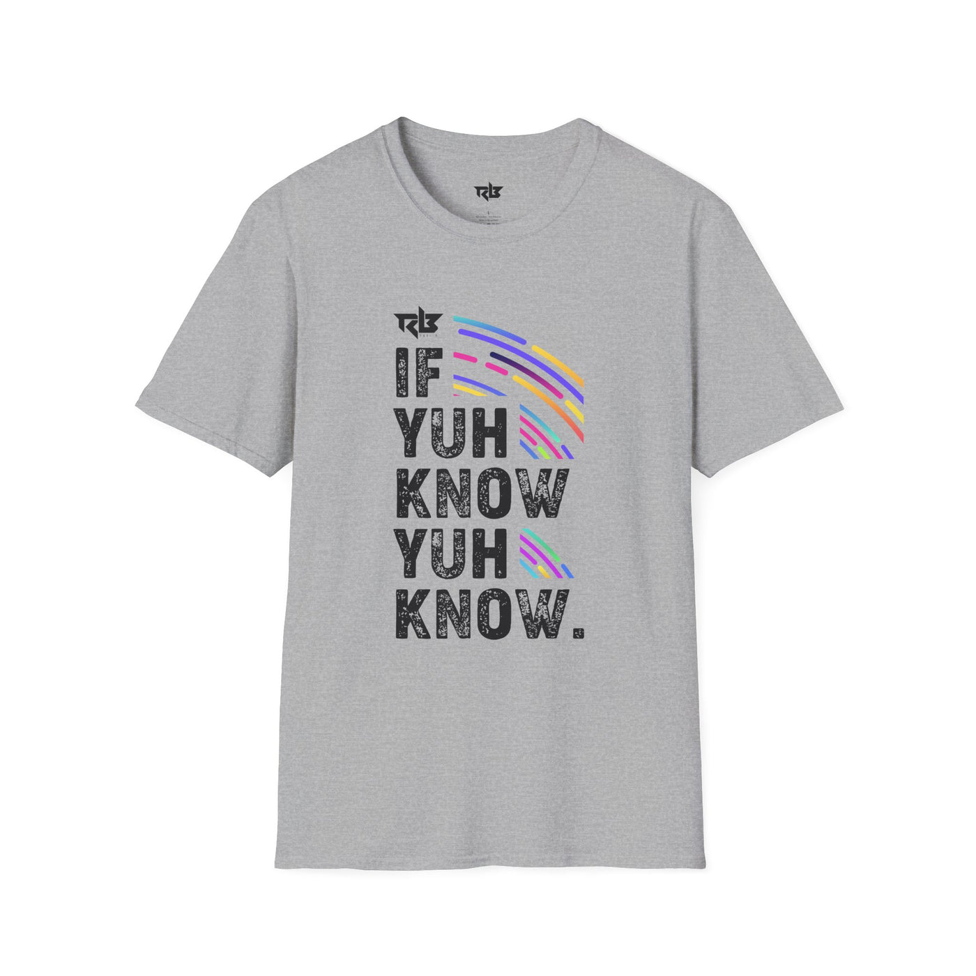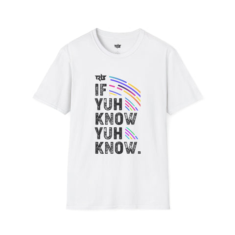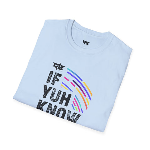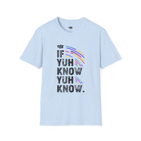Lightweight, breathable, and quietly bold — this tee speaks in shorthand for people who move through rooms with a wink. The front print reads like an inside line: staggered, textured lettering says “IF YUH KNOW YUH KNOW.” Bright, curved strokes of color arc through the print, adding energy without shouting. Wear it on its own for sunny days, layer it under a jacket when the air cools, or pull it on after a long travel day to feel comfortable and seen. The fabric has a soft, broken-in hand that keeps the print crisp while staying gentle against skin. It’s for those who appreciate subtle attitude and lived-in comfort.